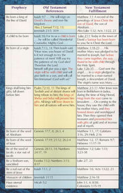 100 Prophecies Fulfilled By Jesus contains a helpful chart that presents Old Testament prophecies that are divided into those regarding "Jesus' Birth," "Jesus' Life and Ministry," and "Jesus' Death and Resurrection" and the New Testament fulfillments of each prophecy. Also included are the "Jesus' Titles and Attributes" mentioned in both Old and New Testaments.