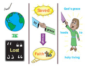 Each card has one or more pictures on the front that represent the main content or message of a Bible book. On the back, a brief description explains the pictures. The back side also includes questions the teacher may ask when reviewing the cards