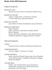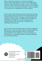 The first half of this booklet contains lists of the most important things, people, places, and events from the Old Testament and the New Testament. These can help you mentally organize the vast amount of information in the Bible. Some of the lists are elementary and simple. Some are more advanced and complicated. Start with the easy lists and add the more challenging ones as you go.