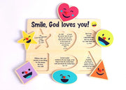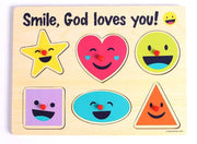 Crafted with care, each wooden shape is designed with a little red plastic peg, making it easy for little hands to pick up and manipulate. The puzzle frame features the uplifting message, “”Smile, God Loves You!”” A constant reminder of love and joy.