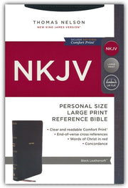 The NKJV Personal-Size Large-Print Reference Bible is a handy compact Bible that features a generous large print font for easier reading. Presented in the full text of the trustworthy New King James Version, the 10.5 point type is an easy-to-read size that is printed along with cross-references for easy biblical navigation.