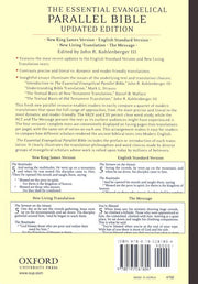 The Essential Evangelical Parallel Bible brings four translations essential to the evangelical Christian community together in one book. This Bible contains the New King James Version (NKJV), the English Standard Version (ESV, the New Living Translation (NLT), and The Message. From the more literal translation such as the ESV, to The Message paraphrase, you can deepen your understanding of Scripture by comparing these popular translations. The Updated Edition contains newly updated ESV, and NLT texts.