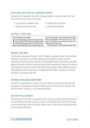 The ESV Compact Bible combines classic portability and improved readability. This complete and compact Bible is perfect for taking God's Word wherever you go-from the daily commute to school; from world travelers to busy moms and dads.