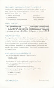 The ESV Large Print Value Thinline Bible includes 10-point Bible text, a quality TruTone cover, and a concordance—all in a portable format that is less than 1 inch thick. Containing the complete ESV text, the Large Print Value Thinline Bible offers tremendous value for a large print Bible.