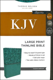 The Thomas Nelson KJV Thinline Bible, Large Print exhibits the classic beauty of the King James translation in the new KJV Comfort Print® font. It's easy to carry and perfect for day to day use. It also features large 11 point print, two ribbon markers, and full color maps.