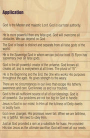 This full-color glossy, 12-panel pamphlet offers an easy-to-use chart format for learning God's names and their meaning such as El Shaddai (The All-Sufficient One), Jehovah-Rapha (The Lord Who Heals), and YHWH (I Am). Each name of God holds a special blessing or promise for those who believe in God.