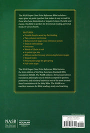 The NASB Super Giant Print Reference Bible features the 2020 edition of the New American Standard Bible translation (NASB). The NASB utilizes a formal equivalence translation philosophy and is widely accepted by pastors, professors, and ministry leaders as one of the most trusted literal translations of the Holy Bible. The NASB is an excellent resource for Bible reading, study, and teaching.