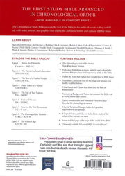 The NKJV Chronological Study Bible presents the text of the NKJV in chronological order - the order in which the events actually happened - with notes, articles, and full-color graphics that connect the reader to the history and culture of Bible times and gives the reader a dramatic, "you are there" experience.