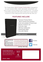 Created to be a go-anywhere Bible, lightweight and portable, this NKJV Compact Thinline Bible features words of Christ in red, a reading plan, and full-color maps.