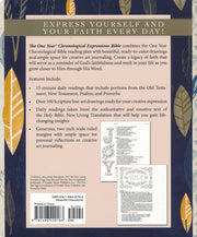 The #1-selling daily reading Bible is more personal than ever with space to read, write, and create! With generous two-inch, lightly-ruled margins and more than 100 artfully drawn verses waiting to be filled in with your most creative ideas, your daily reading experience has never been more personal. The One Year Chronological Bible Expressions contains the entire text of the New Living Translation divided into 365 daily readings. Each day’s reading focuses on a specific moment in biblical history, taking you through the events of the Bible in the order they occurred. Readers are guided through the entire Bible in a sequential, unforgettable journey that’s easier than ever to make your own.