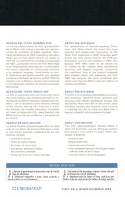 The ESV Spanish/English Parallel Bible honors the diversity and relevance of God's Word in a way that is ideal for Spanish and English speakers, as well as for bilingual readers. Two columns of Scripture are positioned on each page: the Reina-Valera 1960 Spanish text on the left, and the ESV English language text on the right.