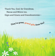 "Thank You, God, for Grandmas, Nanas and Mimis too, Gigis and Grams and Grandmommies—They’re great, grand gifts from You!" No matter what you call her, there is nothing like the love between a grandma and her grandchild! With sweet, rhyming text and adorable illustrations,