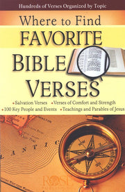 Where to Find Favorite Bible Verses has hundreds of Bible verses organized by topics so you can find the Scripture reference you want quickly and easily. Some of the topics include: God, Holy Spirit, Jesus, Words of Comfort and Strength, Old Testament events, the Life of Jesus, Book of Acts/The Early Church, Money, Prayer, and much more.