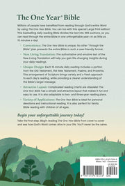 The One Year NLT Large Print Thinline Bible delivers on the promise that as you read its daily Scripture selections you can read through the entire Bible in one year. This beautifully redesigned Bible edition in the clear and trusted New Living Translation features easy-to-read large print (11.1 point font). To provide variety, each daily reading includes selections from the Old Testament, New Testament, Psalms, and Proverbs.