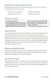 The ESV Compact Bible combines classic portability and improved readability. This complete and compact Bible is perfect for taking God's Word wherever you go-from the daily commute to school; from world travelers to busy moms and dads.