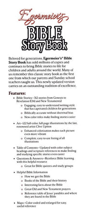 Egermeier's Bible Story Book has sold nearly three million copies and continues to be America's favorite Bible story book. It has 312 stories that cover the Bible from Genesis to Revelation. Younger children will sit spellbound as you read these stories to them. Older children who read for themselves will return to Egermeier's again and again as a trusted friend. Beauty and simplicity of style invites the meaning of the Bible into the child's heart and mind to become an active part of his life, and to never to be forgotten.