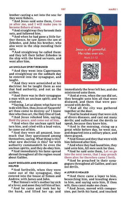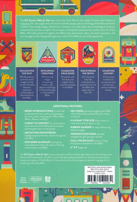 The KJV Explorer Bible for Kids helps kids place God’s Word in the middle of God’s world. Within its engaging, full-color pages, kids will interact with the people, places, and things of the Bible and God’s creation. Fascinating images, illustrations, timelines, and study helps show archeological evidence, introduce key characters, explain new concepts, and help kids experience the wonder and truth of the Bible. QR codes placed throughout the Bible bring educational videos, discussion questions, and activity pages to life, helping kids apply key truths of the Bible to real world experiences.