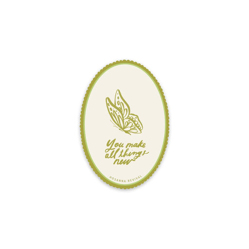 This bright green framed oval sticker features a butterfly alongside a phrase inspired by Revelation 2:5, “You make all things new.” Just as a butt...