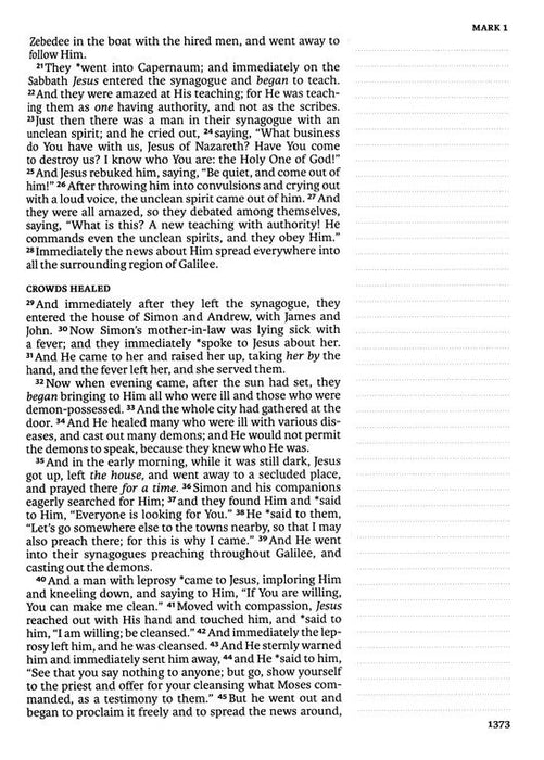 Enhance your personal Bible study or prepare for teaching and preaching with the NASB Notetaking Bible, Large Print Edition. This Bible features large, 10.5-point type in a single-column setting with wide journaling margins on each page to make observations, raise questions, and inspire additional exploration of Scripture. This beautiful Bible provides the perfect place for insights, creating over time an incredible keepsake of your journey.