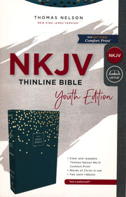 The NKJV Thinline Bible Youth Edition, featuring the trusted New King James Version, is lightweight and convenient—ideal for students on the go. Striking the perfect balance between portability and readability, this Bible fits easily into purses and backpacks, and it comes with features that will enhance your reading experience: the elegant and readable Thomas Nelson NKJV font, two ribbon markers, and the words of Christ in red. This Bible is an ideal option to have a name personally engraved.