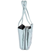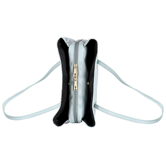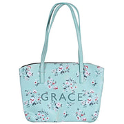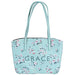The Word Grace Adorns The Front Of This Wedge-Shaped Bible Cover With Purse Style Handles. This Beautiful Cover Features A Mint Green Color With A Floral Design. Roomy Outer Pockets On Each Side. Black Taffeta Lining Throughout. Inside Are The Attached Pen Loop And Ribbon Bookmark.