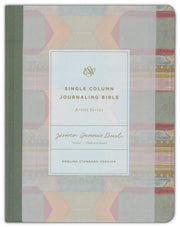 The ESV Single Column Journaling Bible, Artist Series is a collection of journaling Bibles meant to celebrate the treasure of God's Word through the artistic talents of his people. These Bibles feature commissioned cover artwork designed by Christian artists such as Ruth Chou Simons, Lulie Wallace, and Joshua Noom. Each artist offers a visual entry point focused on a particular biblical theme or passage, setting a tone of awe as readers engage with the Bible.
