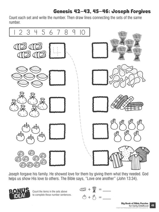 Kids connect to God's Word with the Big Book of Bible Puzzles for Early Childhood. There's big Bible learning fun as children challenge their brains with Bible puzzles. Kids can color and then re-tell the Bible story using their own words, prompted by their own pictures! Great for Sunday School, Children's Church, Evening Programs, Vacation Bible School, Christian Schools, Home Schools, and Camps.