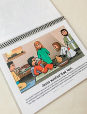This book contains 20 illustrations which tell the story of the death and resurrection of Jesus. Half of this pack is focused on the night Jesus was betrayed, His trial and His crucifixion. It emphasizes the prophecies and events leading up to His death, showing children that Jesus knew what His destination was, and yet He still endured everything.