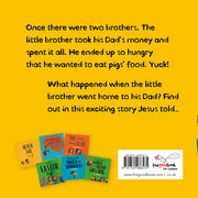 Once there were two brothers. The little brother took his dad’s money and spent it all. He ended up so hungry that he wanted to eat pigs’ food. Yuck!