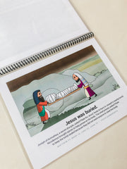 This book contains 20 illustrations which tell the story of the death and resurrection of Jesus. Half of this pack is focused on the night Jesus was betrayed, His trial and His crucifixion. It emphasizes the prophecies and events leading up to His death, showing children that Jesus knew what His destination was, and yet He still endured everything.