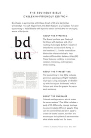 Approximately 17 percent of the global population has dyslexia, yet many do not have the proper resources to easily read God’s Word. The ESV Holy Bible: Dyslexia-Friendly Edition features a specialized typeface and typesetting to help those with dyslexia read the Bible with more clarity and comfort.
