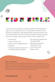 The ESV Kid’s Thinline Bible is a portable, readable, child-friendly Bible for children ages 8–12. The complete ESV text is interspersed with engaging, 4-color inserts containing helpful features that supplement a child’s Bible reading. It also includes child-friendly maps, timelines, and a dictionary for reference. Formatted in the same text setting as the ESV Large Print Thinline Bible, this Bible is easy to take to church, school, or Bible study.