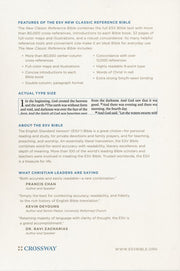 The ESV Reference Bible, previously called the ESV Classic Reference Bible, combines the ESV text with a robust concordance and one of the most comprehensive and useful cross-reference systems available today—more than 80,000 references conveniently located in the center column on each page. This edition includes 32 pages of full-color maps and illustrations of historic biblical sites, structures, and objects for ready reference and insight. The ESV Reference Bible balances helpful reference features with a portable size, making it an ideal Bible for everyday use.
