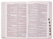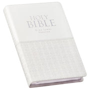 Lovely pure White Faux Leather Bound King James Bible. The cover is constructed of quality man-made material imported from Italy, with the look and feel of real leather (trade name LuxLeather). Design features include a front to back debossed stylized celtic design, silver foiled debossed title, silver gilt-edged pages with thumb indexing and an attached ribbon page marker. Inside, you'll find reader-friendly subheadings, a double-column format, words of Christ printed in red ink, a helpful Scripture verse finder by topic and a one-year Bible reading plan.