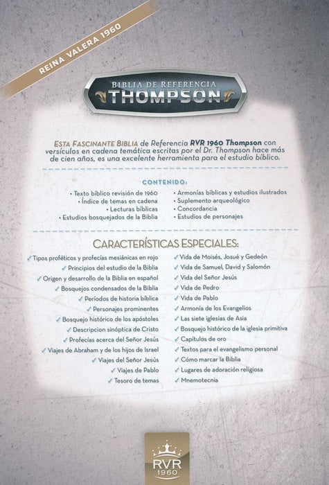 La Biblia de Referencia Thompson, versión Reina-Valera 1960 con Índice, es sin lugar a dudas la Biblia más completa que se puede encontrar. Es prácticamente una biblioteca de referencia bíblica con más de 7,000 nombres, lugares y temas y más de 100,000 referencias analizadas y clasificadas de acuerdo con los conceptos. Las ayudas marginales están "encadenadas" a ocho secciones al final de la Biblia, donde la profusión de detalles es superior a cualquier otra Biblia publicada. Está diseñada para ayudar al lector a identificar miles de temas significativos, conceptos, ideas y personajes bíblicos, e investigar las referencias de estos temas a través de toda la Biblia. Es un sistema completo, fácil de entender y de usar. Esta es la Biblia ideal para el pastor, el maestro de Escuela Dominical, el laico y el estudiante.