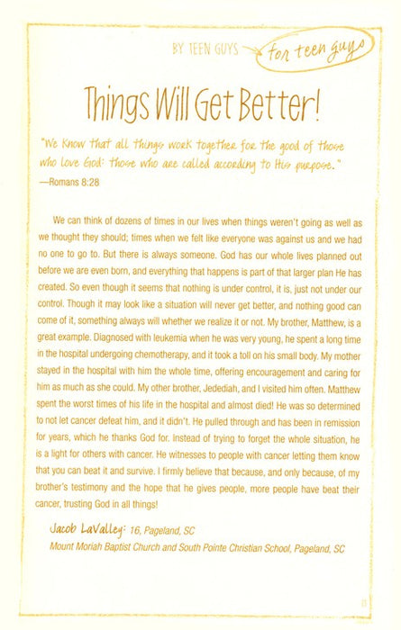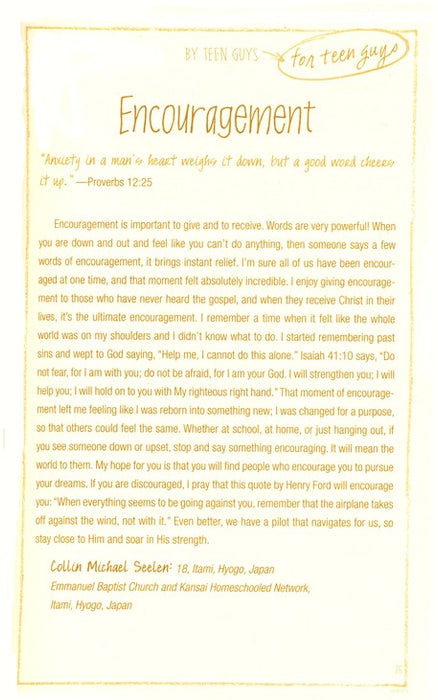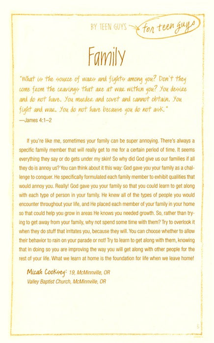 Written for teen guys by teen guys! This 365-day devotional is filled with personal experiences that encourage teens to learn how to deal with difficult issues and maneuver their way into adulthood. Each devotion inspires teens to develop a deeper relationship with God, in a secure and safe social atmosphere.