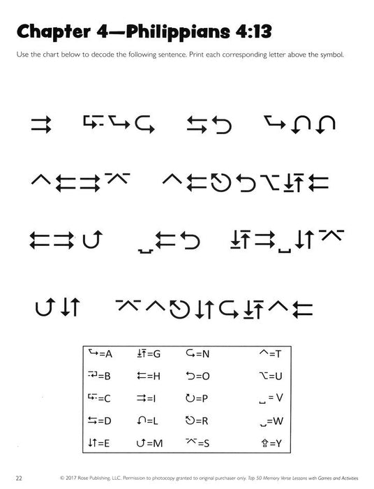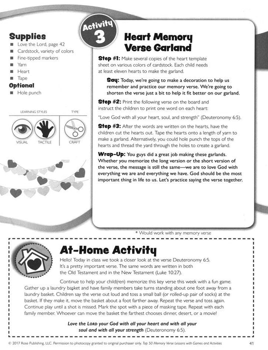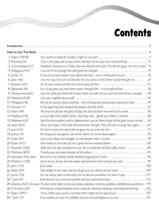 Top 50 Memory Verses. Memory verses are vital to hide God's Word in the heart and mind of every child. This book is packed with fun, interactive, creative and engaging ways to get children excited about memorizing Scripture. The 50 verses are in an easy-to-learn format. Ages 5 to 10.