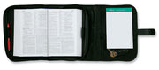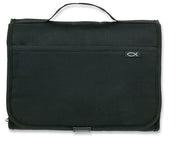 Stay organized with this tri-fold Bible cover that features multiple pockets, a sturdy spine carrying handle and interior pen and pencil holders. Made from durable nylon material, this organizer-style Bible case folds in and secures to protect your Bible and all of your other belongings.