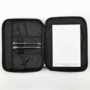 This organizer has an interior credit card organizer, a notepad slot, five pen/pencil loops, a zipped mesh interior pocket and an interior slip pocket. It has a decorative fish emblem on the front and comes with a free notepad and pen/marker.