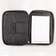 This organizer has an interior credit card organizer, a notepad slot, five pen/pencil loops, a zipped mesh interior pocket and an interior slip pocket. It has a decorative fish emblem on the front and comes with a free notepad and pen/marker.
